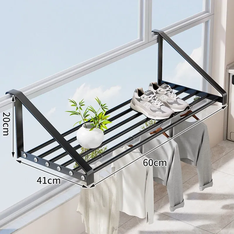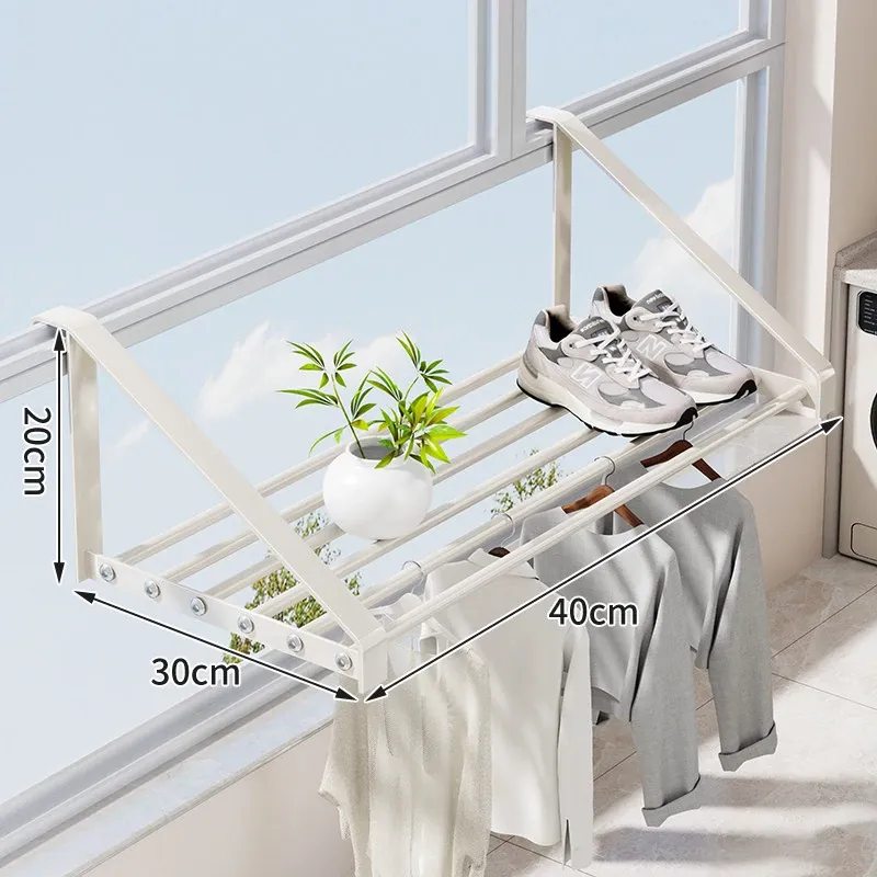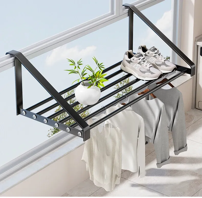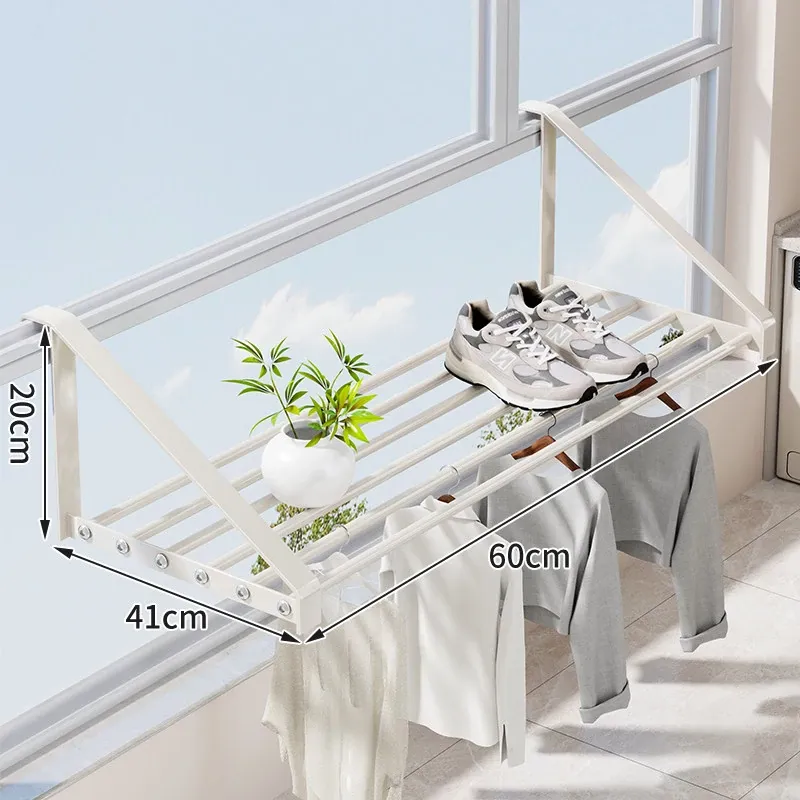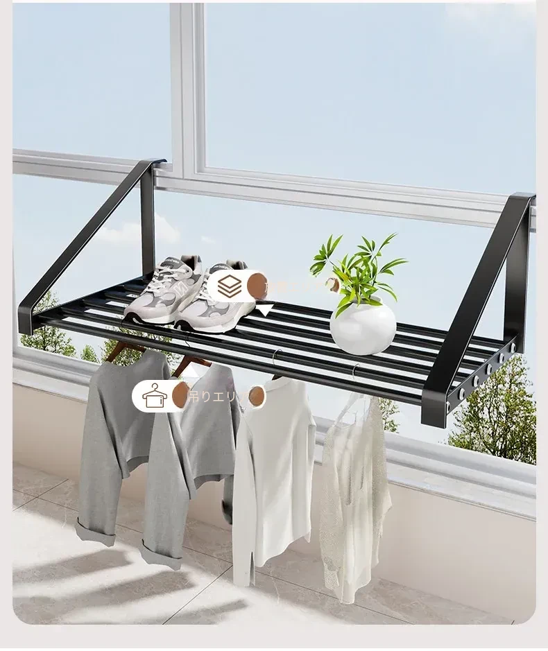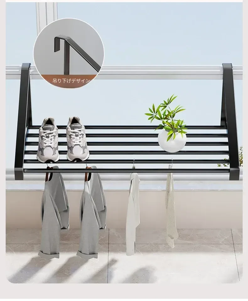 バルコニー用多機能衣類干しラック!収納できるガードレール付きで、室外での使用に最適。靴や小物もすっきり整理できる便利なハンガー。これでおしゃれに干す楽しみを!