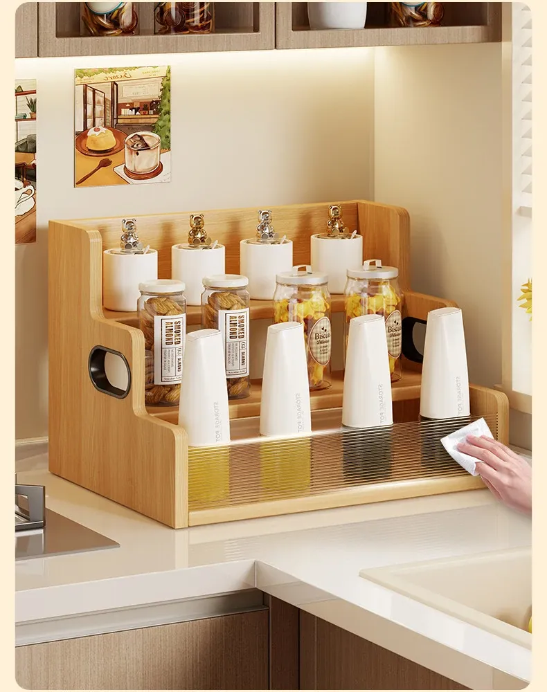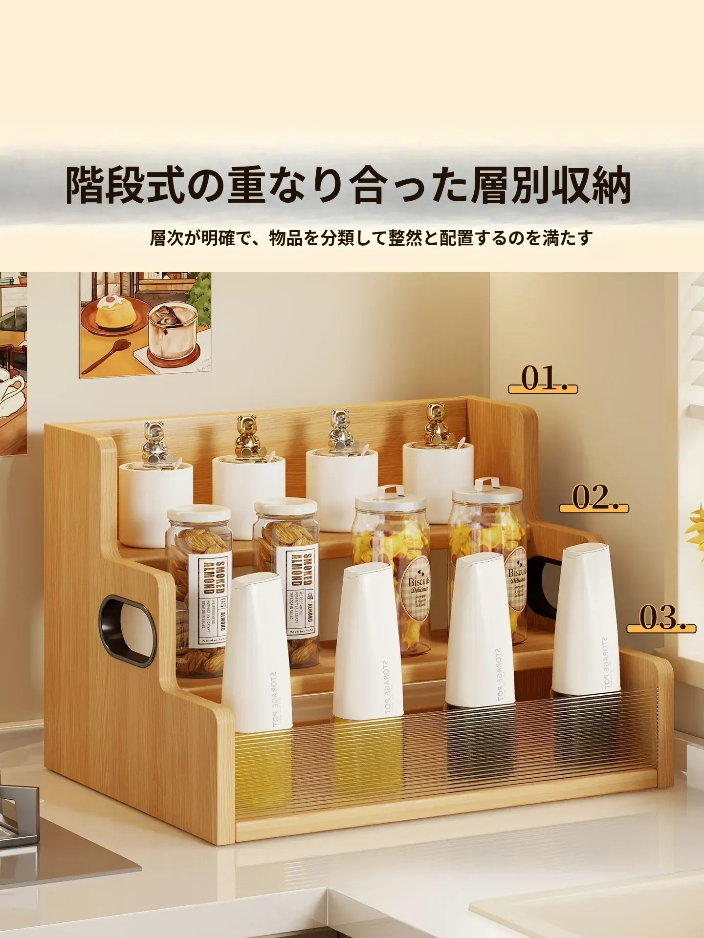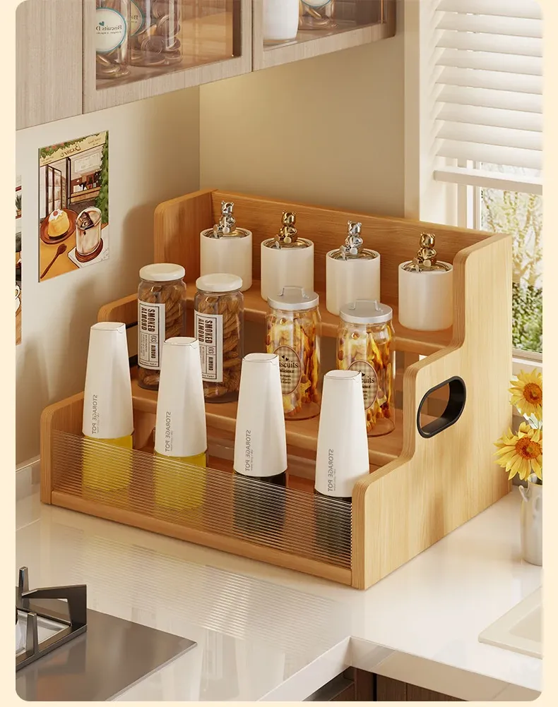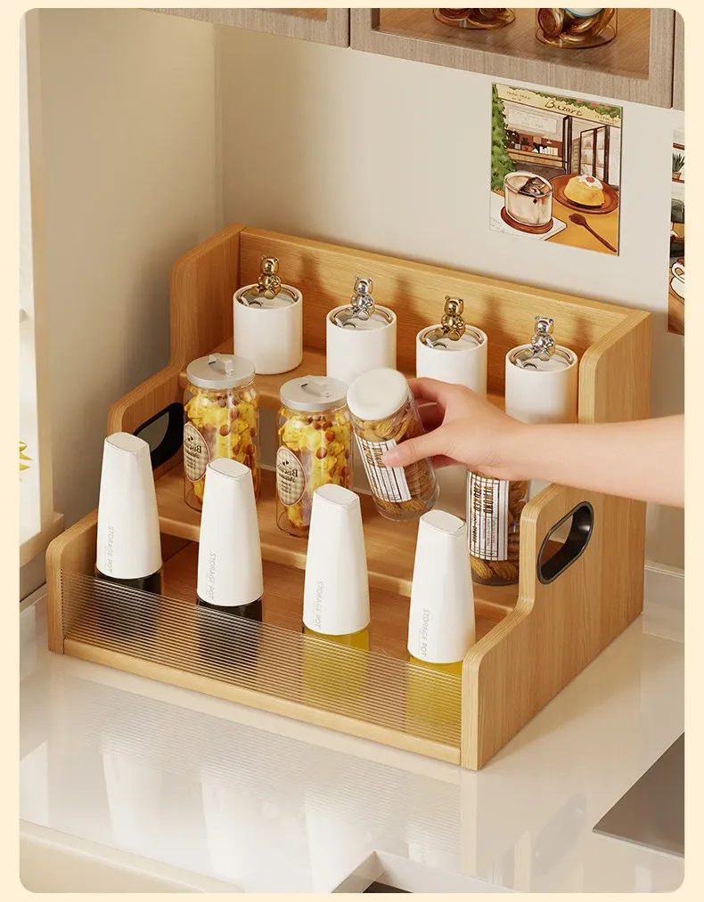 デスク上収納ラック - キッチンやダイニングテーブルにぴったり!多段階整理で調味料やスナックをすっきり収納。省スペースでおしゃれなデザイン、生活をもっと便利に!