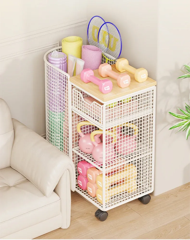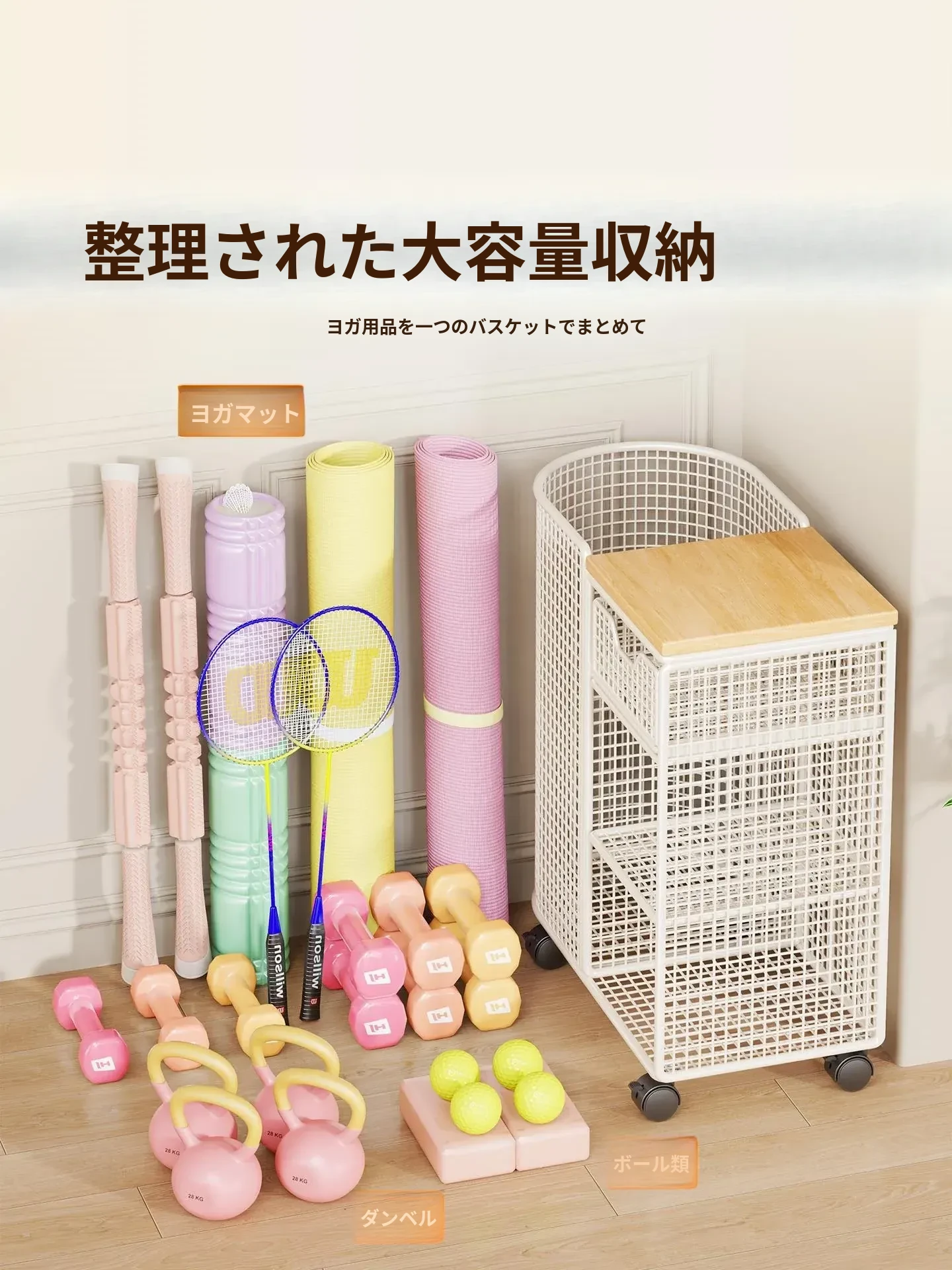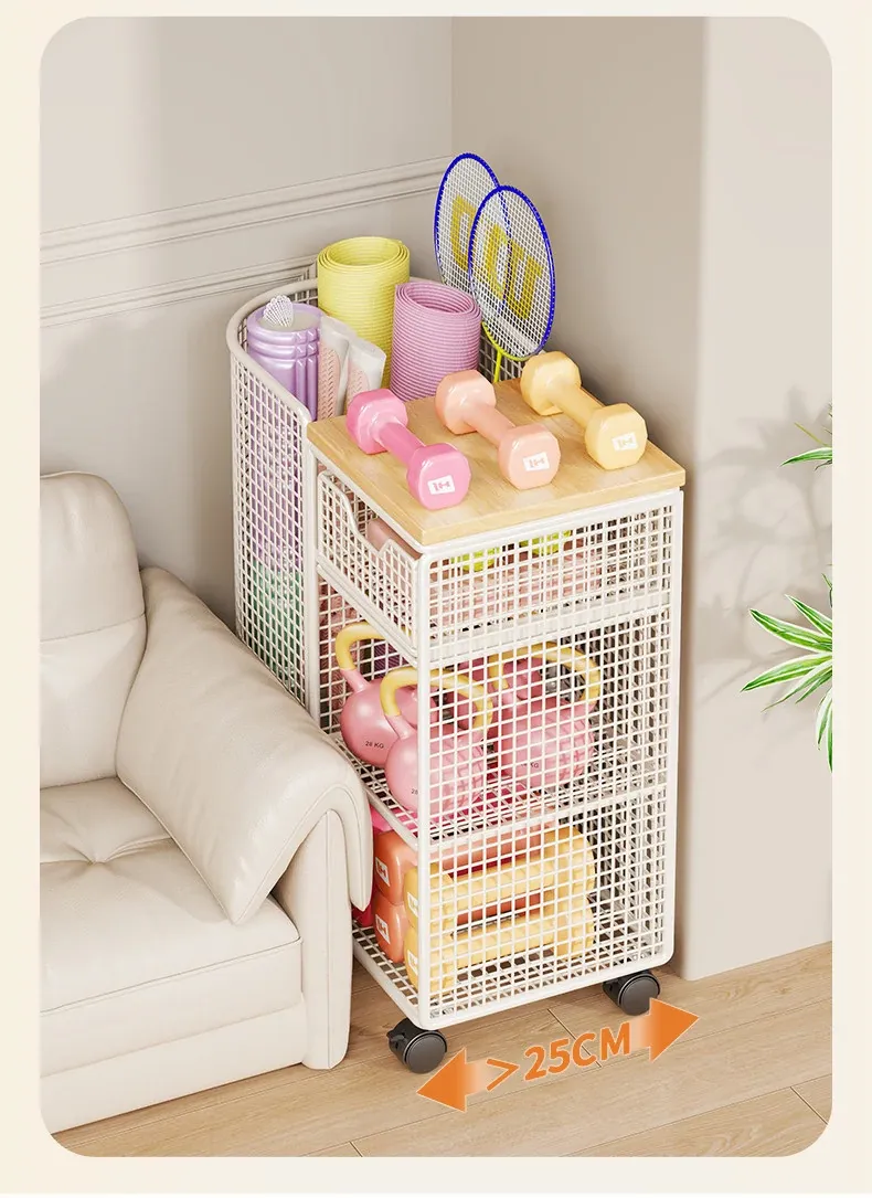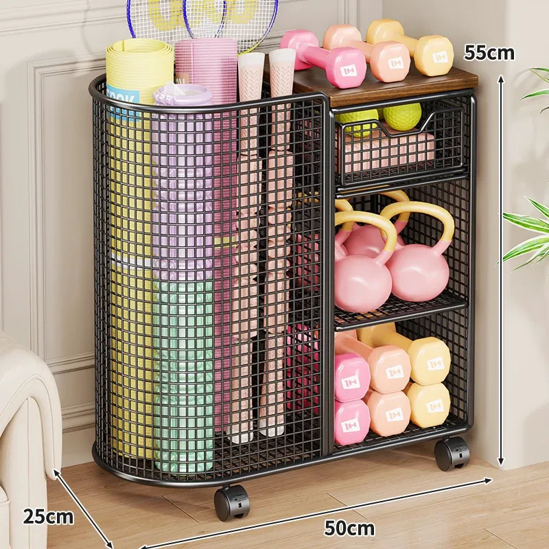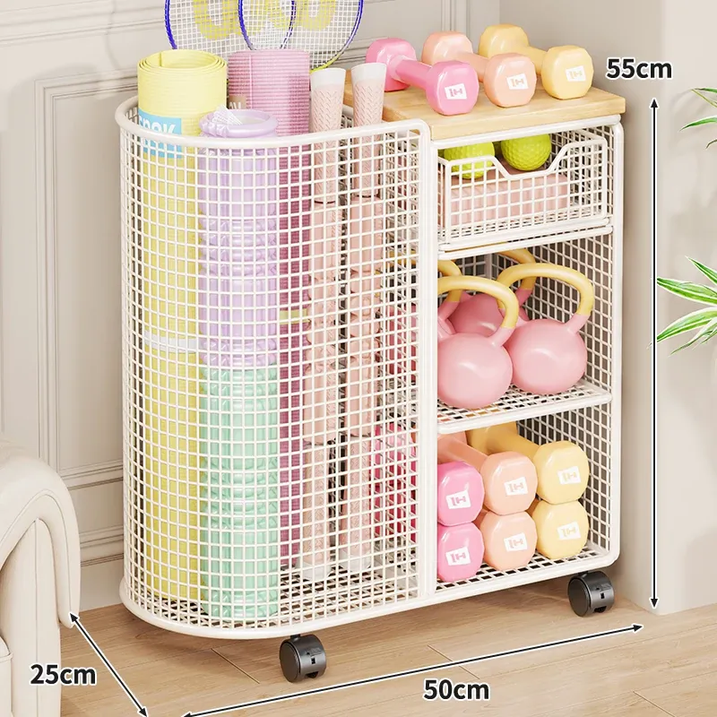 ヨガマット収納バスケット 移動可能なキャスター付き 隙間収納 ボール類用品やスポーツ器具を整理整頓!フィットネスグッズの収納に最適なラックです。