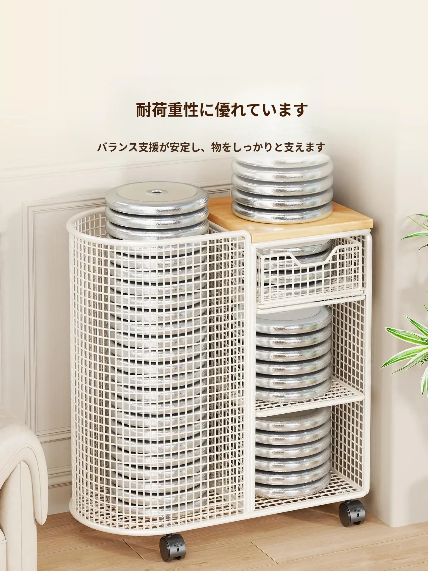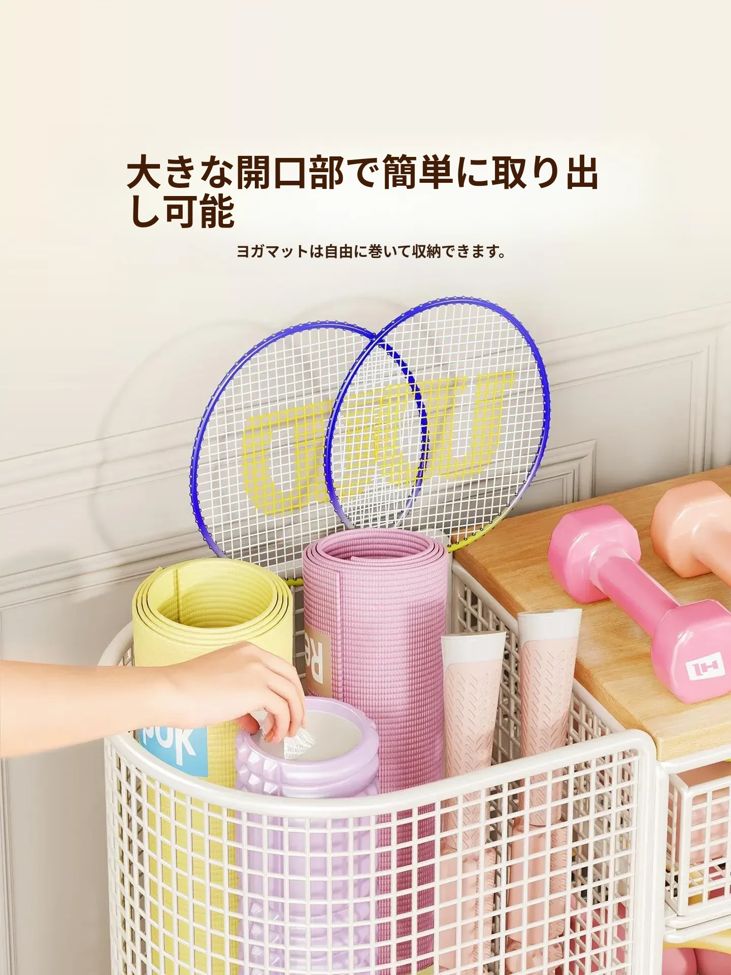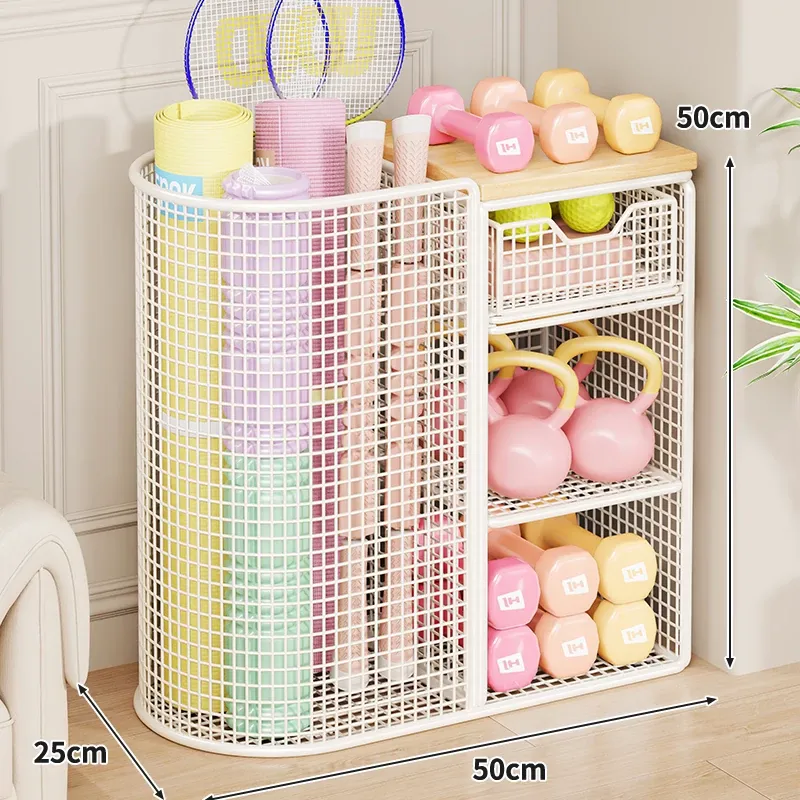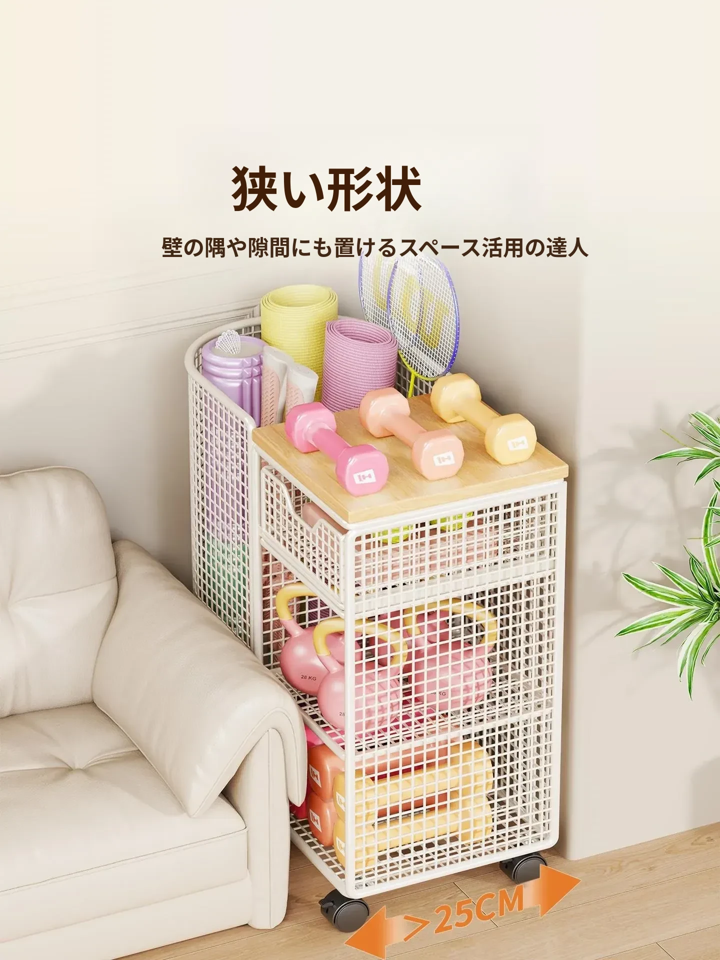 ヨガマット収納バスケット 移動可能なキャスター付き 隙間収納 ボール類用品やスポーツ器具を整理整頓!フィットネスグッズの収納に最適なラックです。