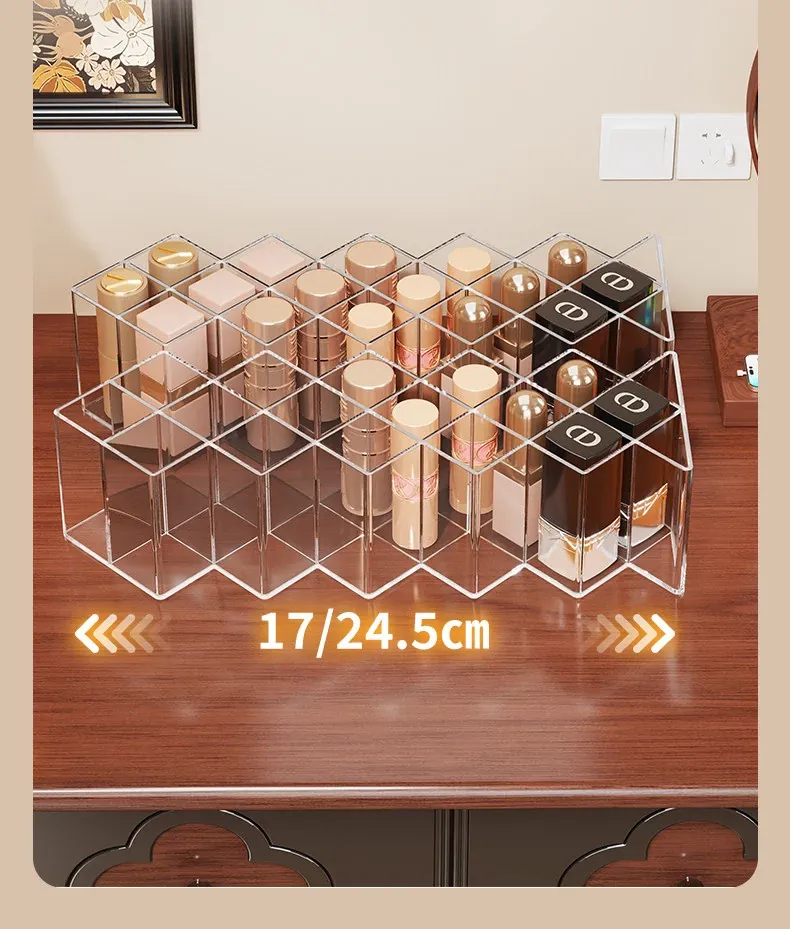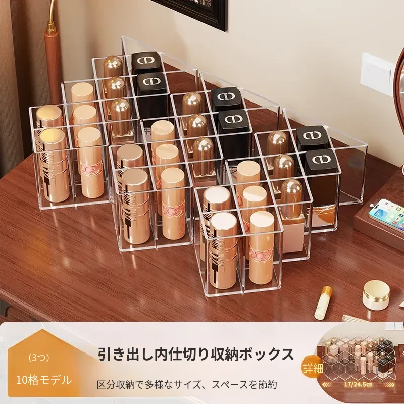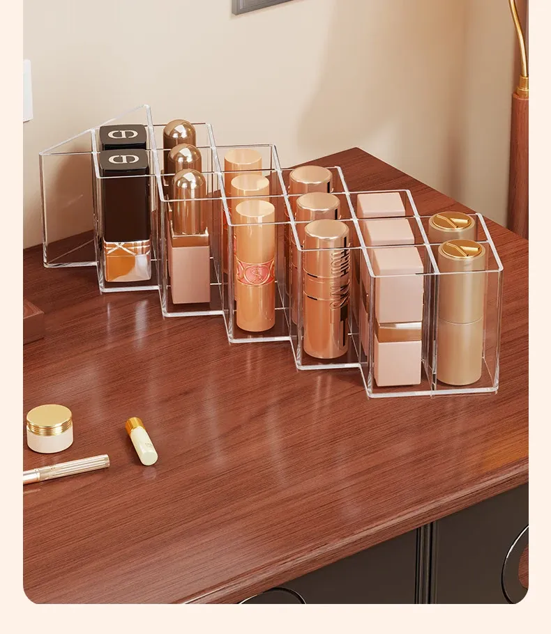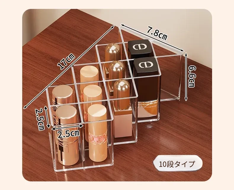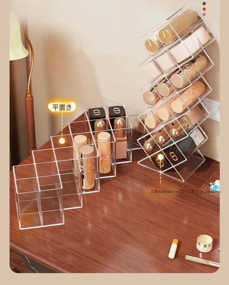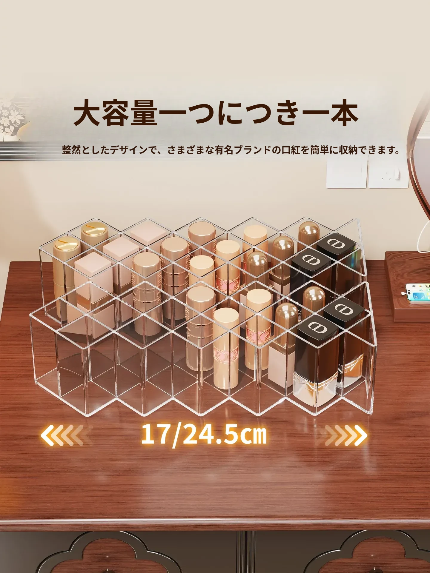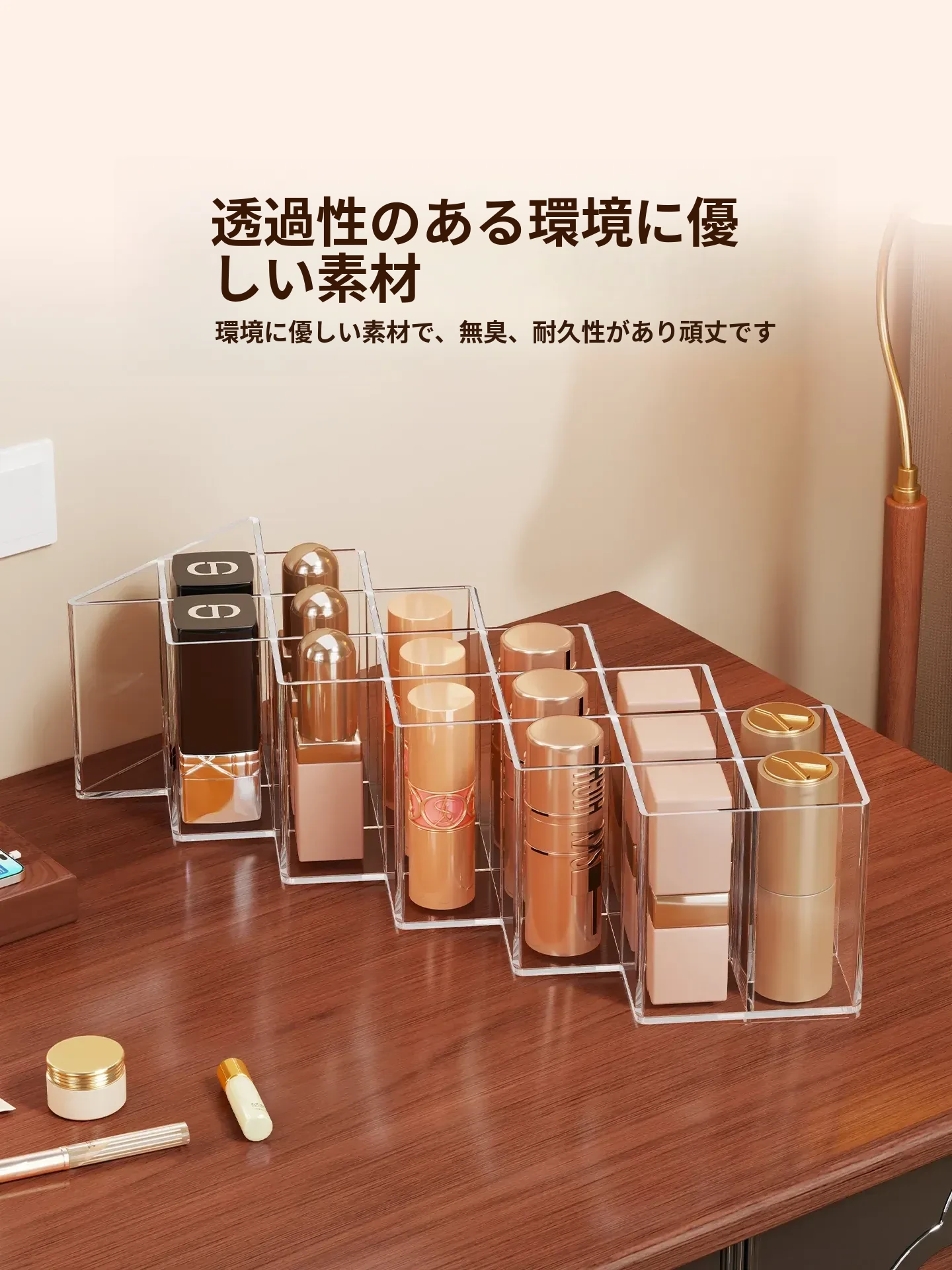 高級感溢れるデスク用リップ収納ボックス!多段式唇彩スタンドで、香水やエッセンスのサンプルもスッキリ整理。透明デザインで一目で分かる、おしゃれで便利な整理整頓アイテムです!