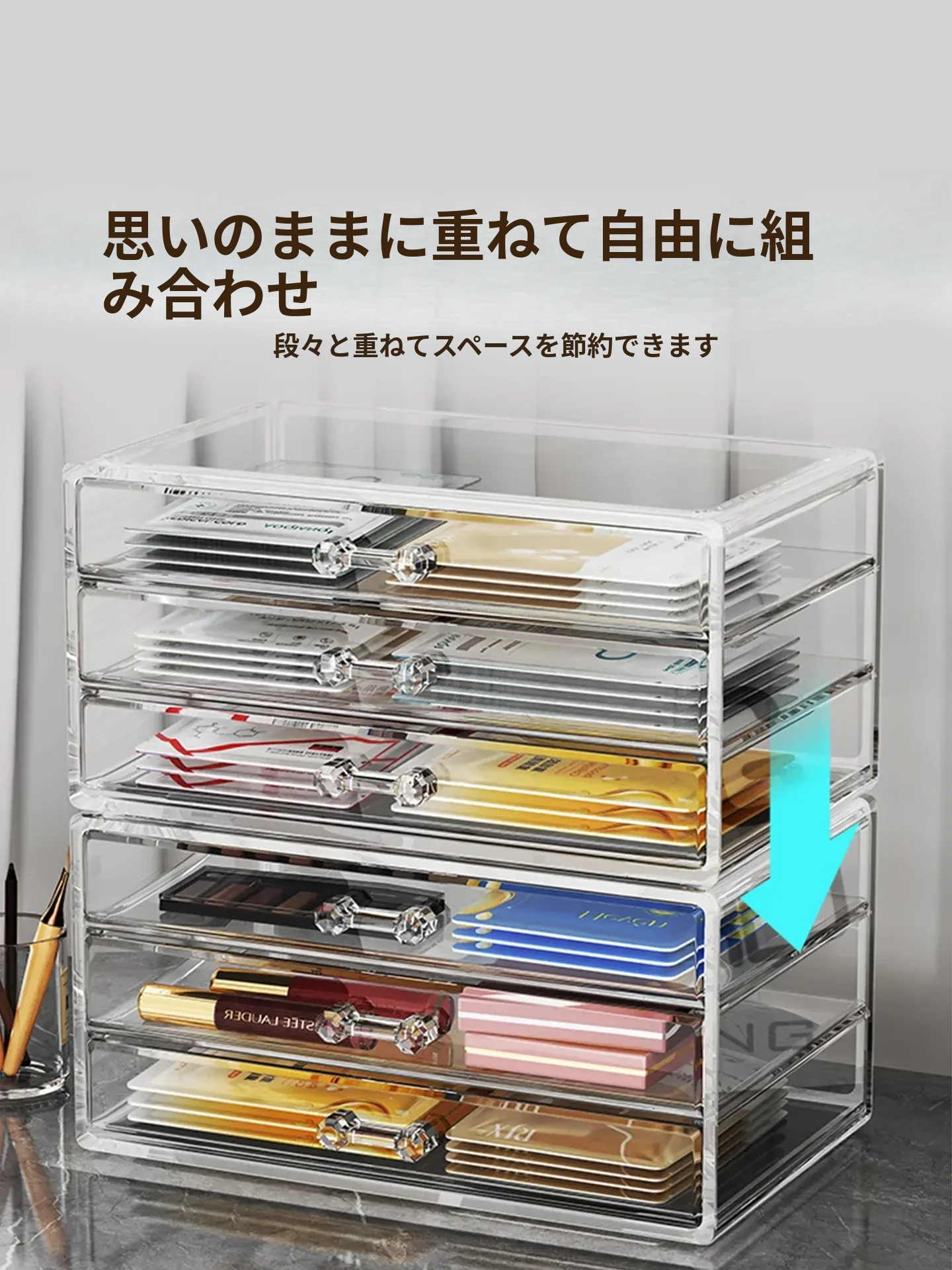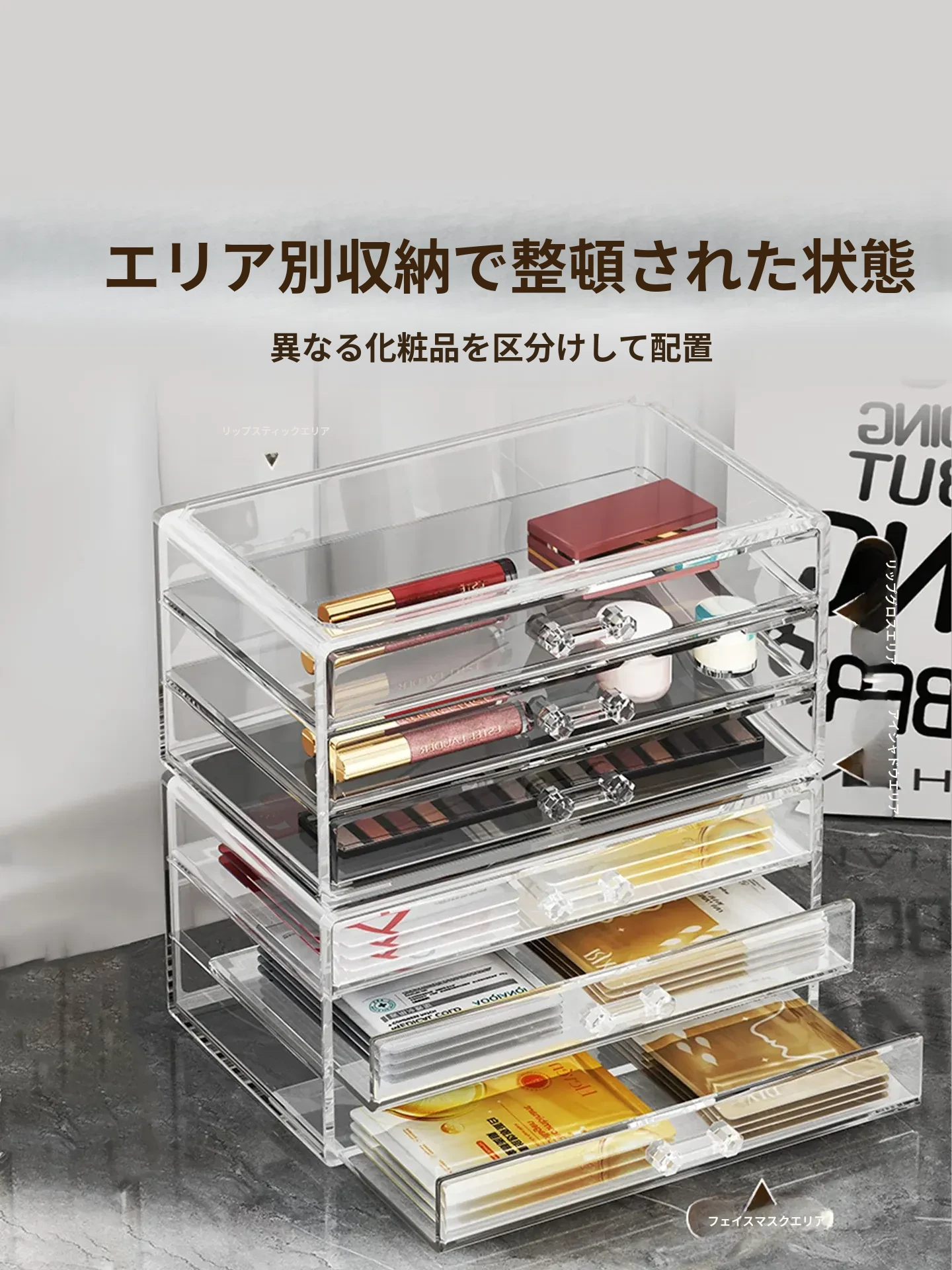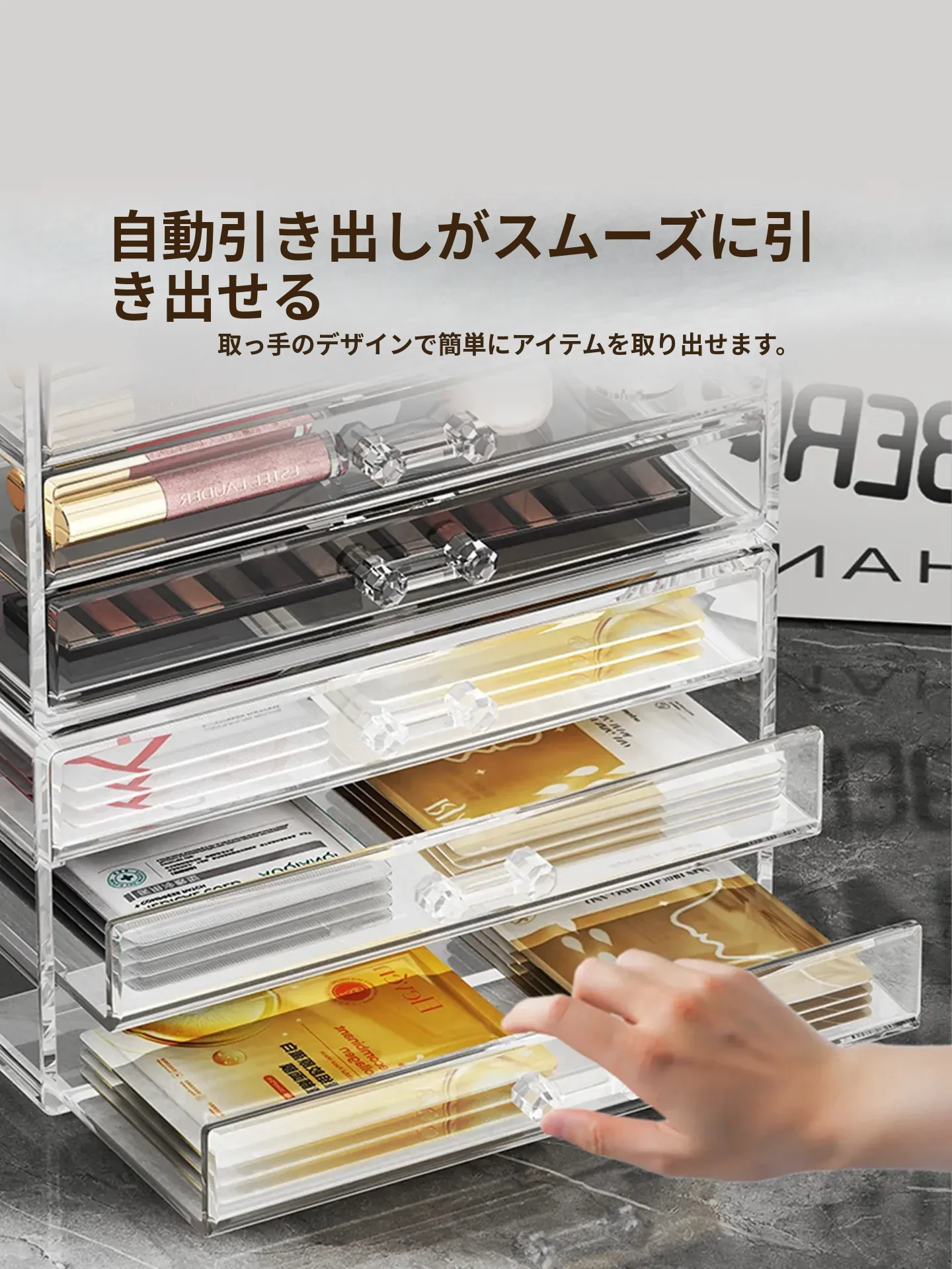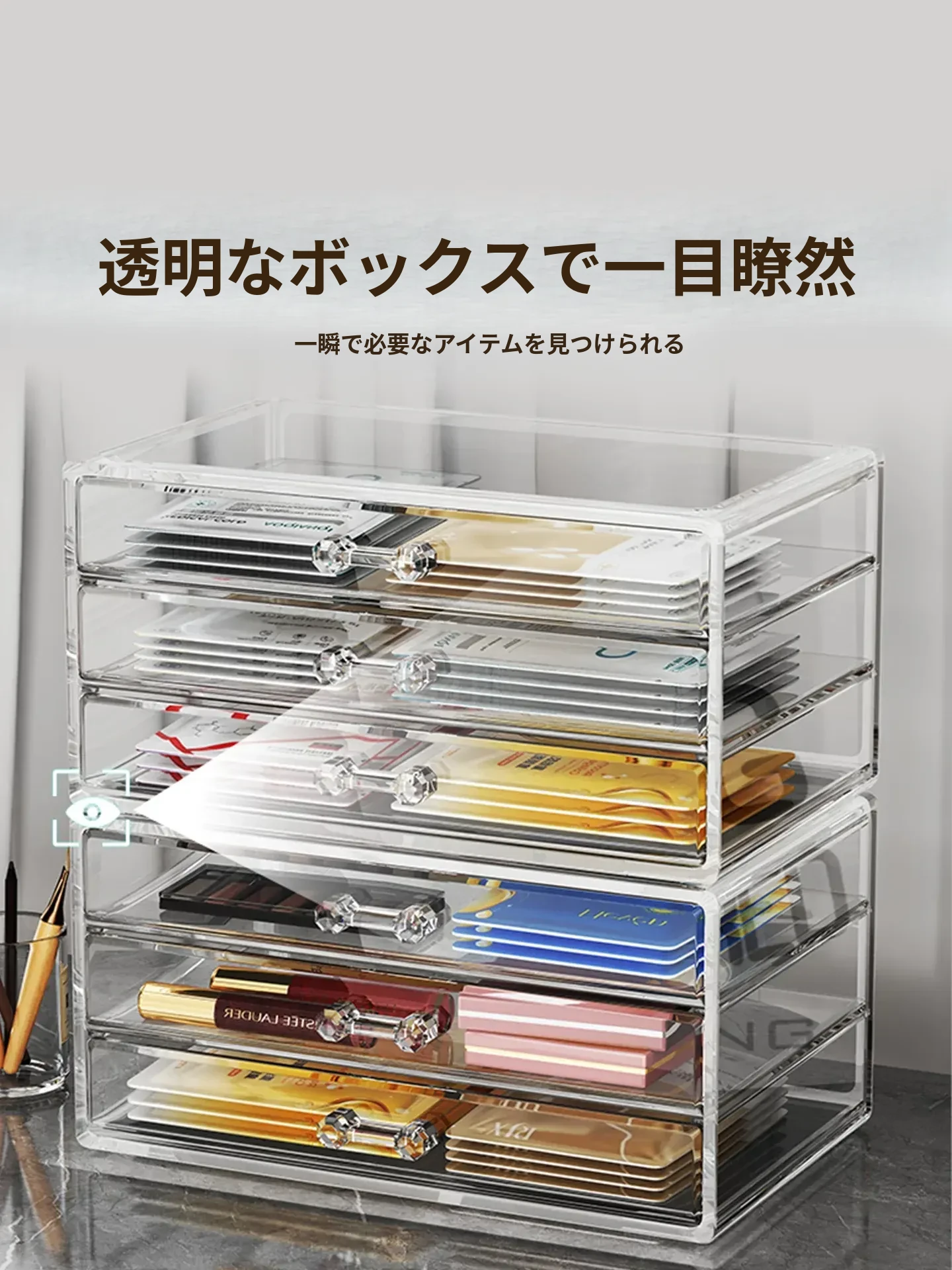 透明デスクトップ収納ボックス|メイクやスキンケアに最適な防塵抽斗式フェイスマスク収納ケース|おしゃれで機能的な化粧品&小物整理用キャビネット
