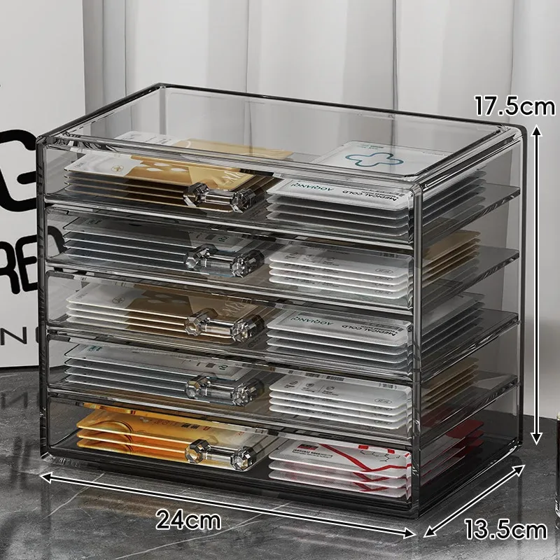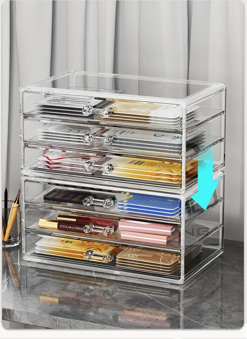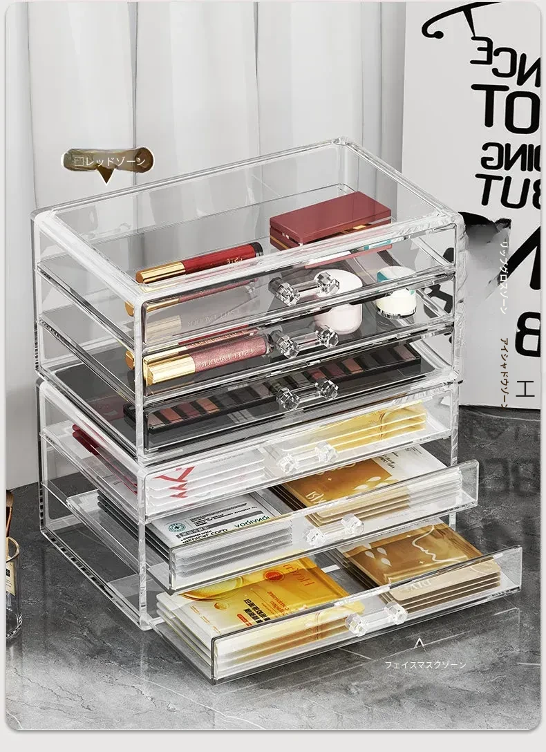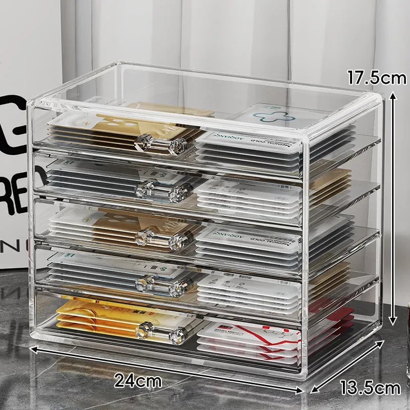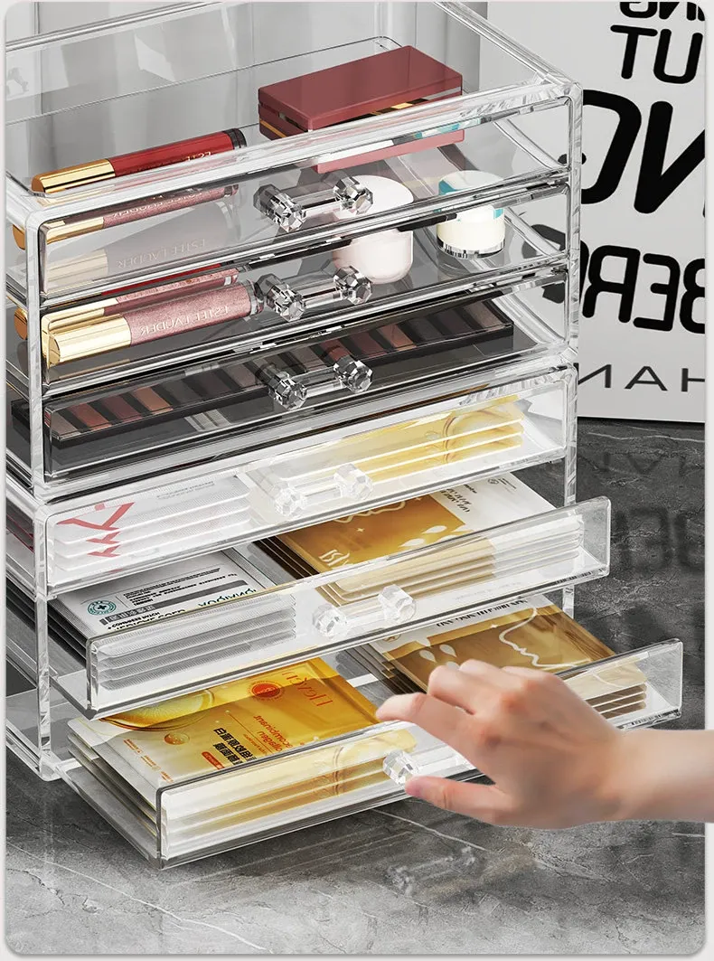 透明デスクトップ収納ボックス|メイクやスキンケアに最適な防塵抽斗式フェイスマスク収納ケース|おしゃれで機能的な化粧品&小物整理用キャビネット