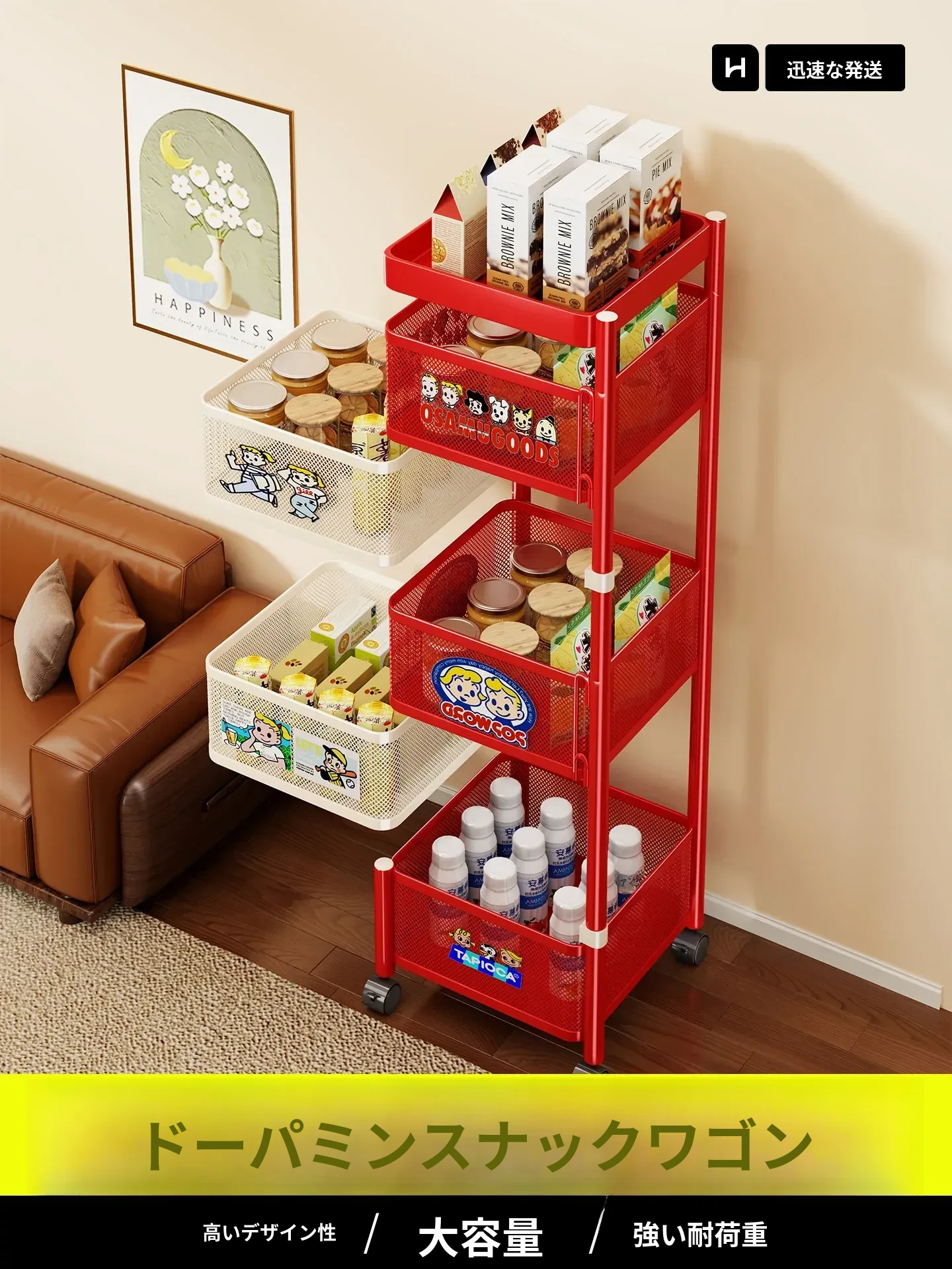 おしゃれなスナックカート - リビングで使える多機能回転収納ラック!家庭用移動式ストレージ、キッチンやリビングにぴったりの多層収納棚。お部屋をスッキリ整理して、毎日をもっと楽しく!