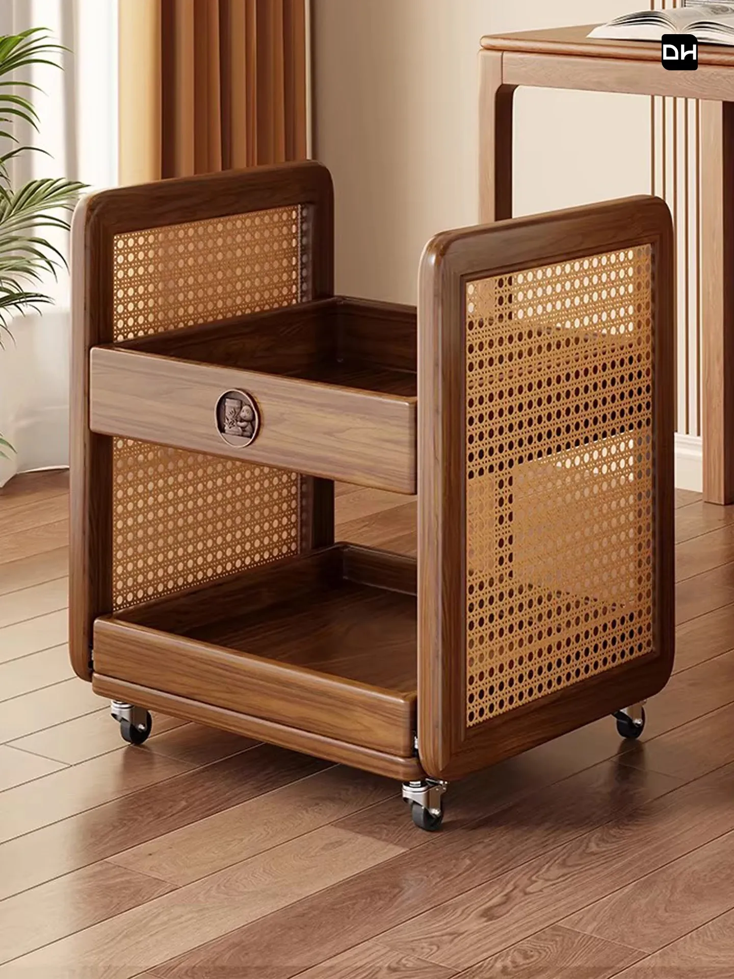 実木製の書籍収納棚 - 移動可能な小型カート、オフィスデスク下にぴったり!学生のためのダブルレイヤーで効率的に書籍やバッグを整理整頓。シンプルでスタイリッシュなデザインで、どんな空間にもマッチ!