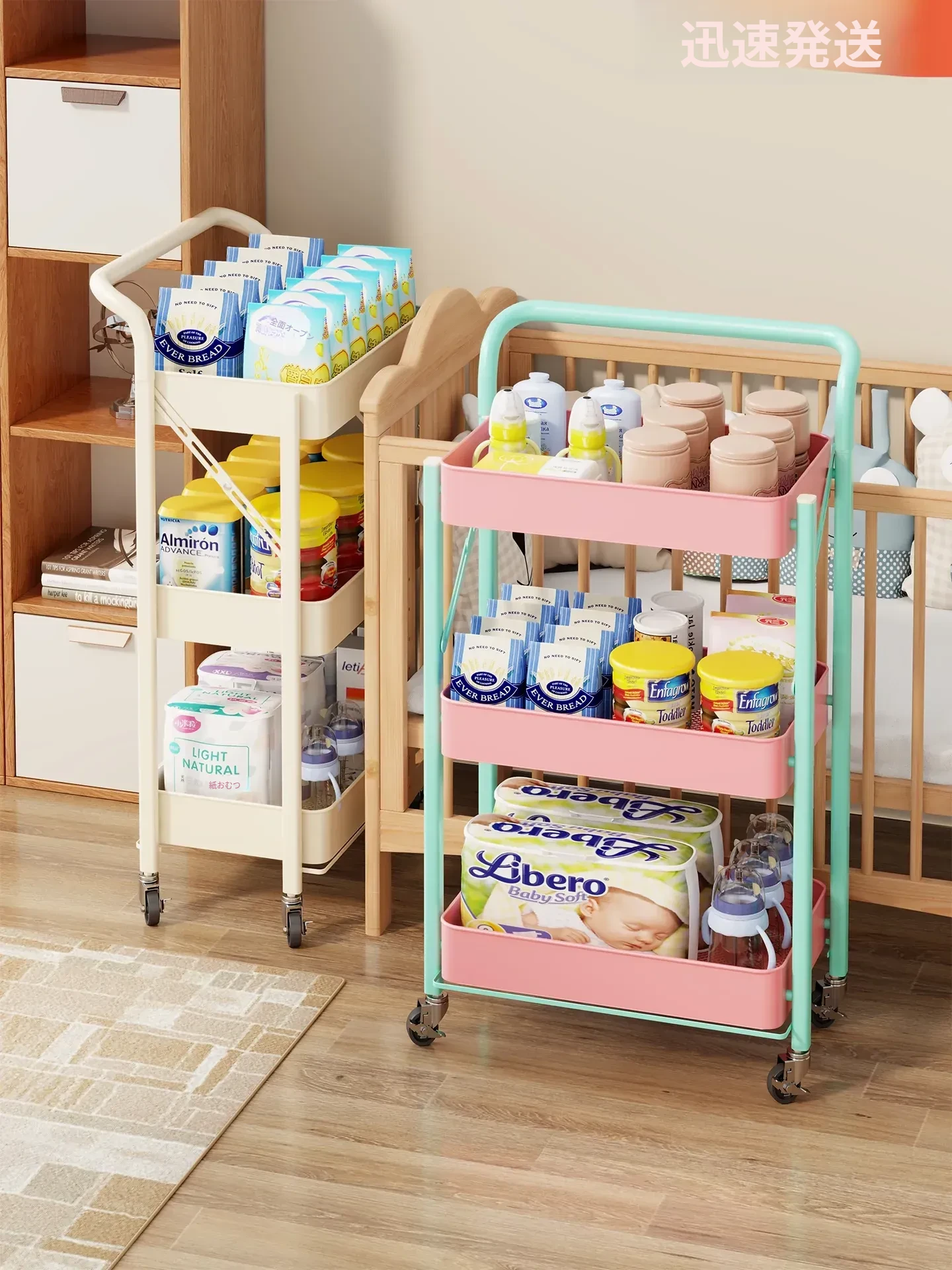 赤ちゃん用品の折りたたみ式収納ラック - 新生児のための多層ベッドサイド推車、離乳食やおもちゃをすっきり収納!お部屋をおしゃれに演出します!