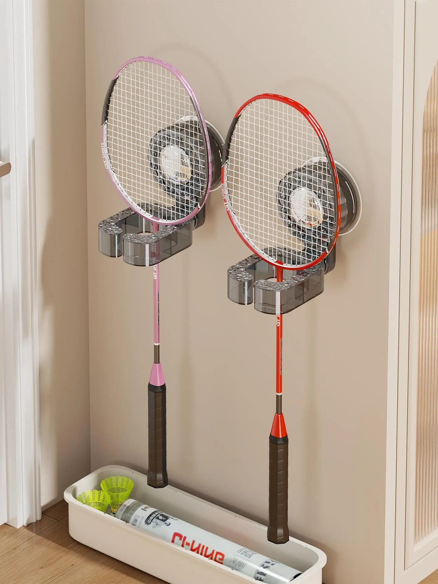 バドミントンラケット収納ラック 壁掛けタイプで穴あけ不要!多機能スポーツラケットストレージ、家庭での整理整頓に最適!クリーンでスタイリッシュな空間を実現します。