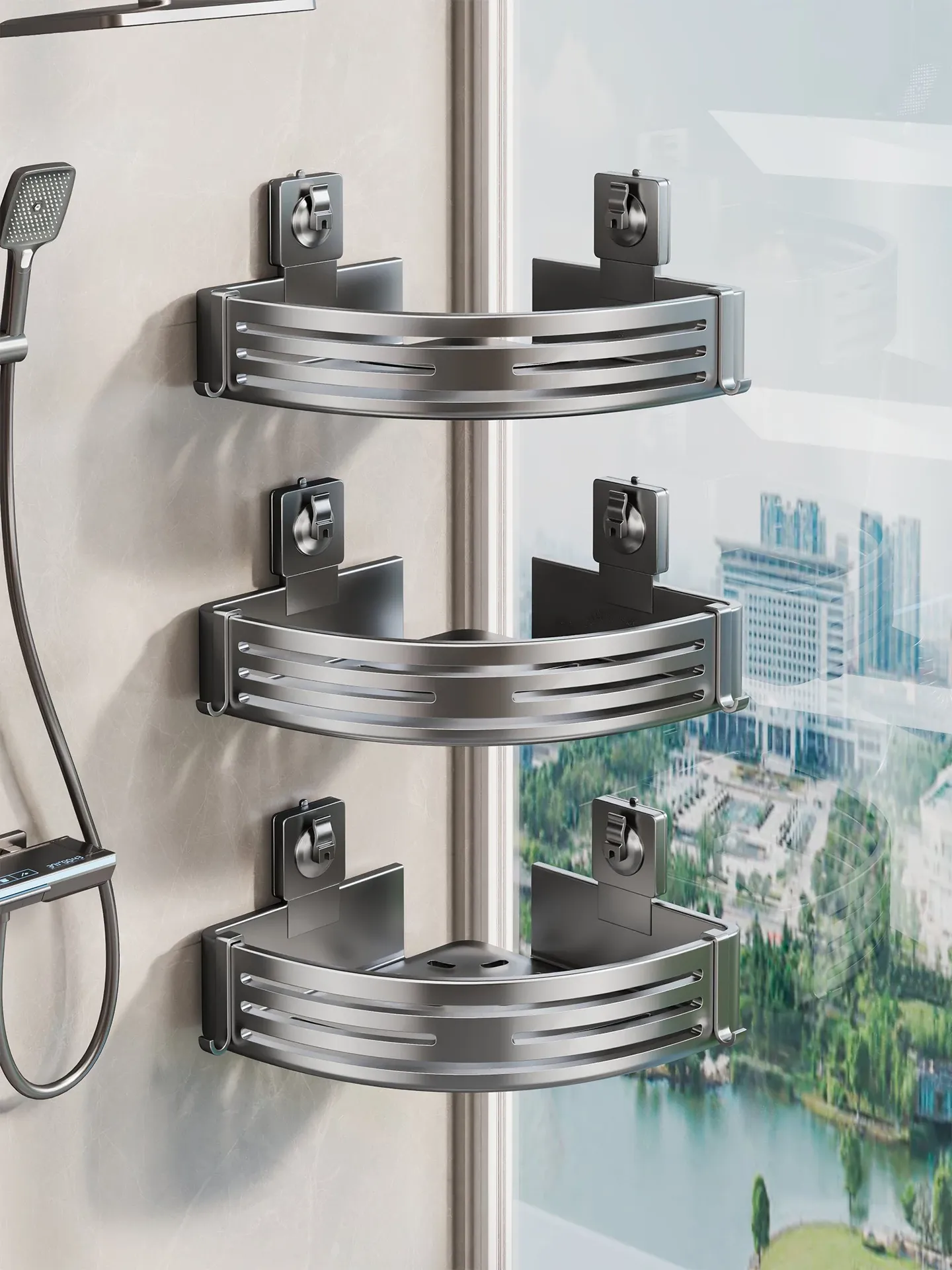 バスルーム収納ラック|トライアングルデザインの洗面台用コーナーラック|穴あけ不要で簡単設置|シャンプーやボディソープをスマートに収納できる!